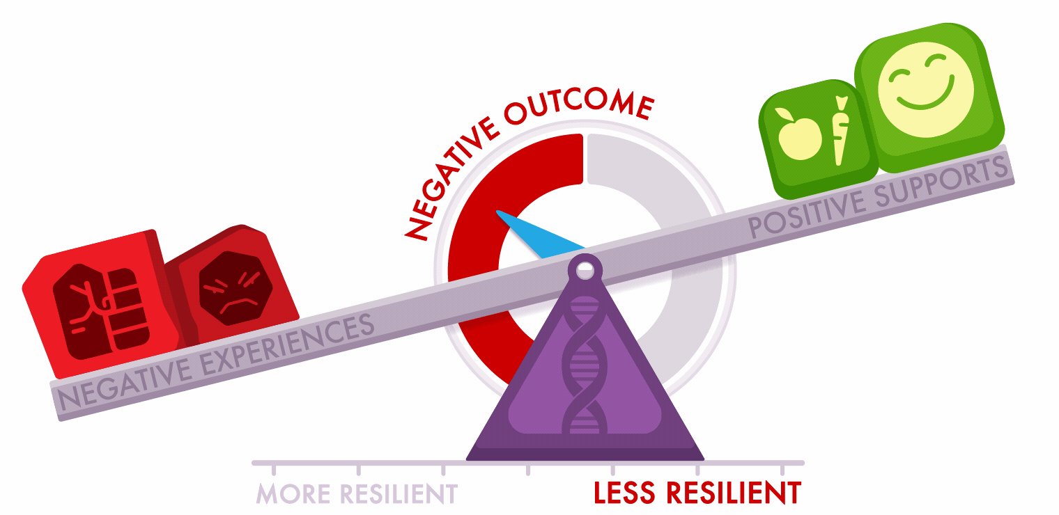 A person’s resilience scale is a good predictor of health outcomes, and what gets placed on the scale in early childhood is especially important. When the scale, weighed down by positive experiences, tips in a positive direction, a person is more likely to experience good health, academic success, strong relationships, and economic security. A person with a scale weighed down by experiences that cause toxic stress will have increased risk for stress-related diseases, including diabetes, heart disease, anxiety, depression, and addiction. Many of these outcomes surface in adolescence or adulthood, long after the resilience scale was loaded by experiences in early childhood.